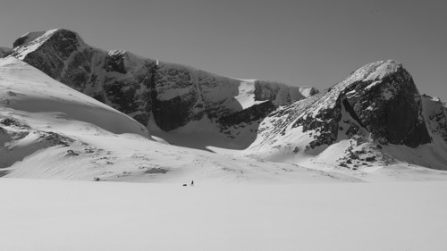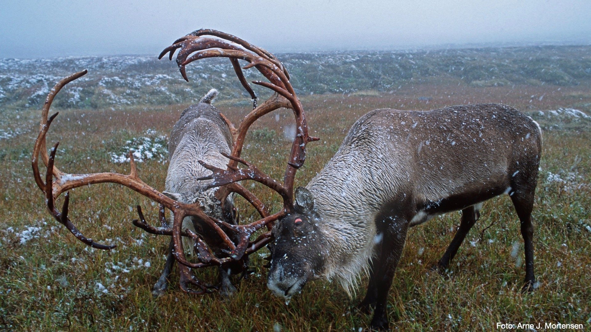 "Villreinen strever for tida. Grådyra, som var en forutsetning for tidlig bosetting i innlandet, som ga oss mat, klær og redskaper, er plutselig blitt et problem. Vi eter oss innpå dens marker. Mine bilder på årets utstilling på Rudi Gard har flere svart-hvitt bilder enn tidligere. Men mørke skyer har ofte en lys kontrast... Jeg håper bildene kan speile noe av dagens utfordringer. Velkommen til utstillingen EVIGE JAKTMARKER!" - Arne J. Mortensen